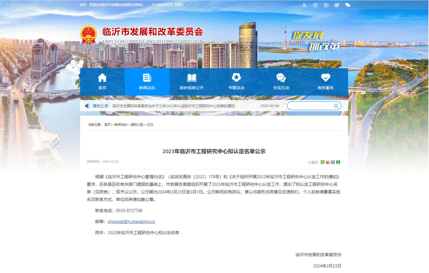 公司近期收到由臨沂市發展和改革委員會發布《2023年臨沂市工程研究中心擬認定名單公示》,經專家評審和網上公示,公司申報的“臨沂市工程技術研究中心”進入擬認定名單。